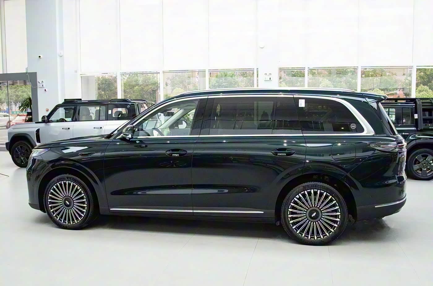 再来看车身侧面部分,侧面采用纯平B柱设计,5205mm车长配合1998mm超宽车身,塑造出修长稳健的轮廓。悬浮式车顶与双拼色车身(需选装)形成视觉分层,21英寸多辐轮毂(255/45 R21)搭配隐藏式门把手,既降低风噪又提升整体感。车身采用78%高强度钢占比,侧围防撞梁强度达1500MPa,在轻量化与安全性间取得平衡。